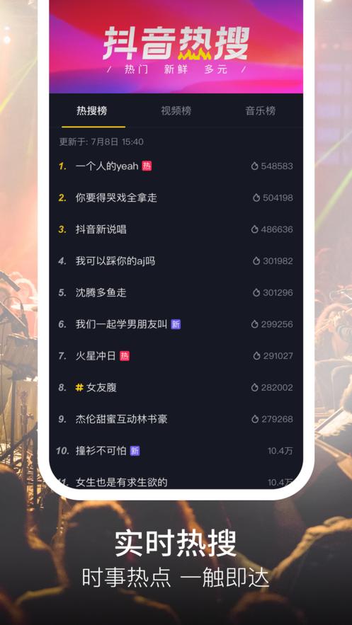 全球潮流音乐,搭配舞蹈、表演等内容形式,还有超多原创特效、滤镜、场景切换帮你一秒变大片,为你打造刷爆朋友圈的魔性短视频。脑洞有多大,舞台就有多大!好玩的人都在这儿!