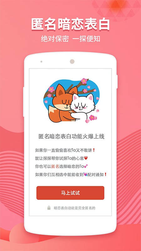 探探是一款非常方便实用的手机交友软件,它的功能非常的强大,探探能够帮你推荐附近的优质人人群用户,采用滑动式选择用户,创意感十足!同时探探还支持视频聊天、自定义表情、真心话大冒险等功能,让互动变得更加有趣,从而帮助用户早日找到心仪的另一半。