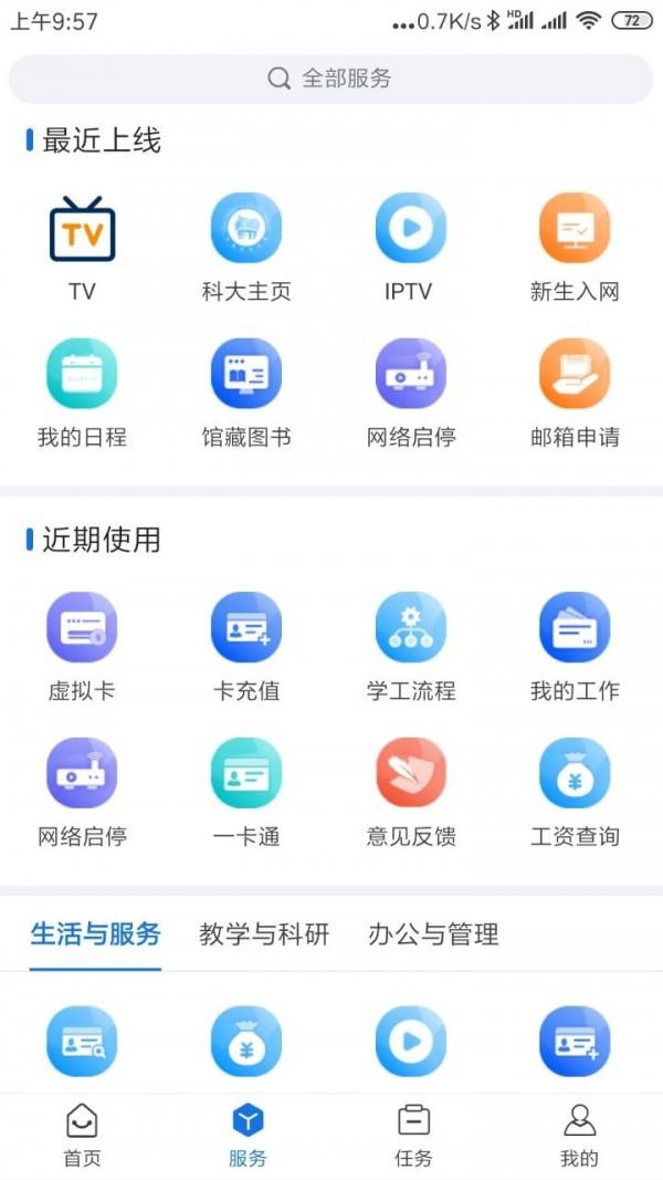 3、“应用”界面,可以看到目前上线的各种应用,教职工、学生能看到各自的专属应用以及公共应用。目前为大家提供了“在线网络报修”、“工资查询”、“课表查询”、“成绩查询”、“一卡通消费查询”、“上网查询”等应用。