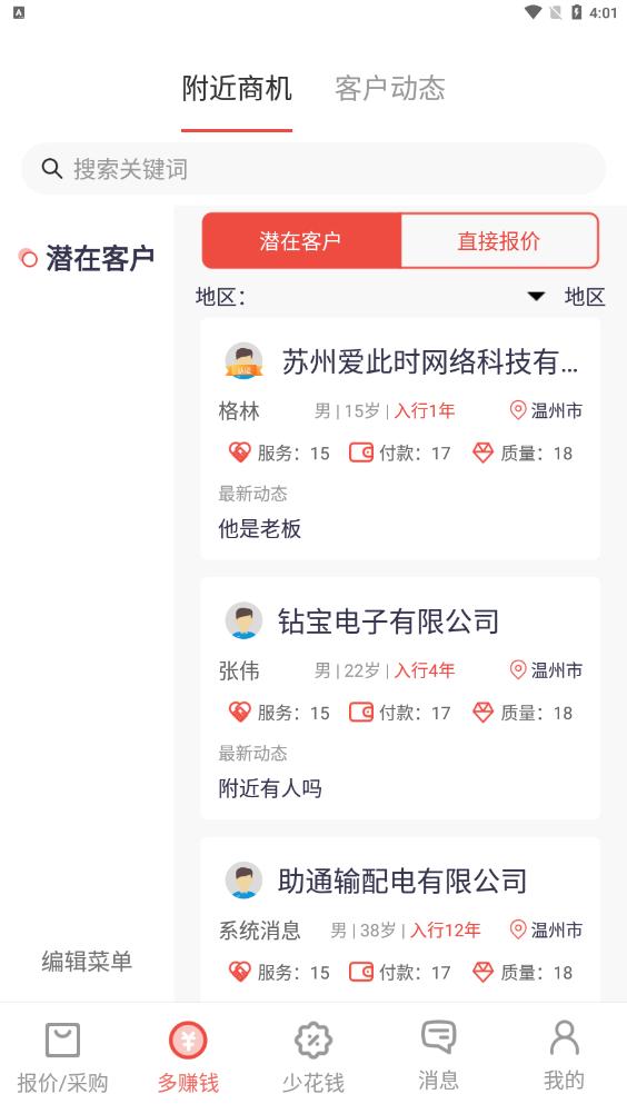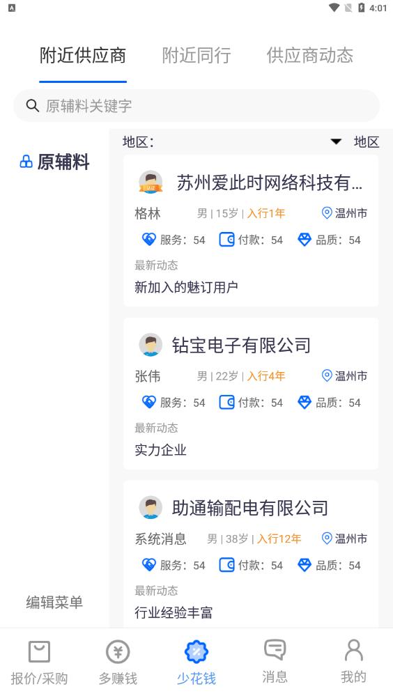 3.内部询价,提高效率,内部整合各个供应商,通过沟通快速找到对应的客户,让用户省钱买材料,轻松找到客户。