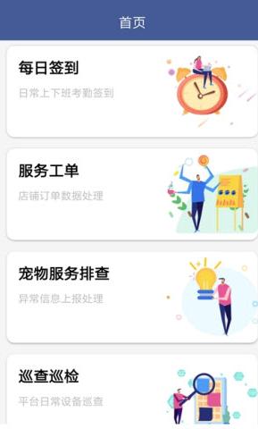 2.首页有多种功能选项可供选择,如每日签到、服务票、宠物服务检查、检查