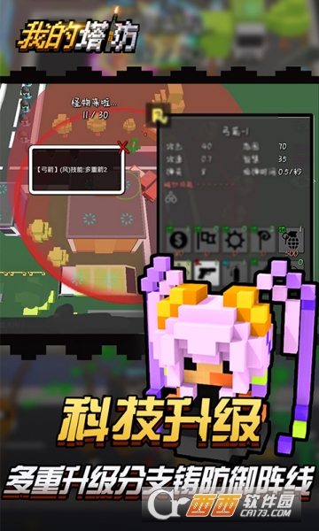 7 防御塔升级。每个防御塔升级分为:人物升级、武器升级。人物升级每级可以获得属性点,可由玩家自由分配。升级武器 获得新技能、技能升级、武器进化等。