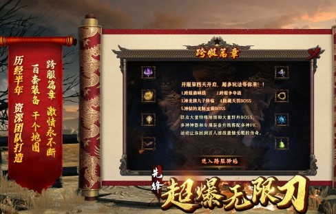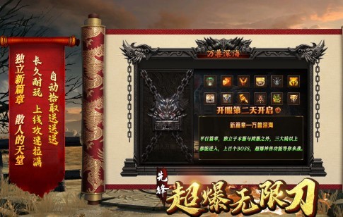 先锋超爆无限刀传奇来袭,无限刀传奇竞技游戏,神器资源非常丰富,多元传奇服务器,上线获取自动拾取功能,全屏轻松切怪,散人轻松逆袭竞技,开局送超强时装盛装套装,快速升级,爽快竞技,轻松霸服,传奇礼包奖励:996盒子礼包*1,100000元宝*5,多套时装轻松获取,多样地图轻松尝试,趣味无限的创新竞技版本传奇,非常值得去尝试的传奇竞技游戏。
