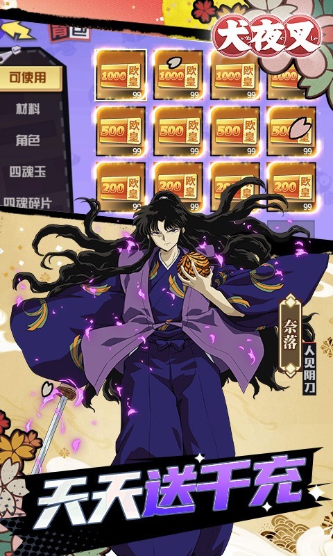 1.月卡1元购买,良心游戏,福利满满。上线输入LB888888就送SSR杀生丸和188888判金。