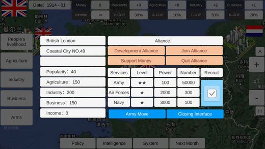 2、在游戏里你可以控制一个国家,通过调整政策来发展经济或是提高财政收入;