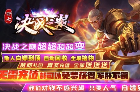 四七决战之巅传奇游戏来袭,刺激神器传奇,轻松白嫖无限传奇资源,传奇礼包奖励:泣血赤魂*1,决战石*50,所有传奇装备都能打怪获取,游戏的消费非常低,非常绿色的传奇环境,公平设计,升级非常轻松简单,限时轻松上手,无限惊喜福利,散人专属服务器,非常值得去尝试的传奇竞技游戏。