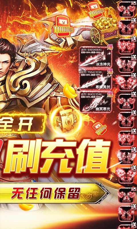 2、充值比例1:10000,每笔尊享超高额外返利!装备全部打怪爆出,灵符、元宝爆率全开!