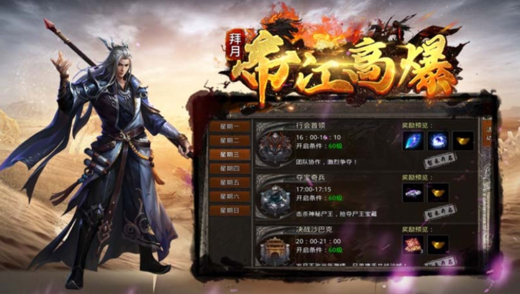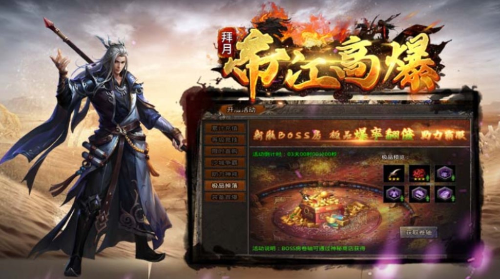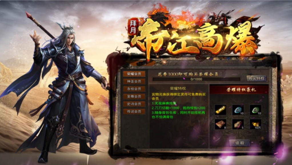 拜月帝江高爆传奇来袭,高爆传奇竞技游戏,传奇爆率全开,传奇礼包奖励:高级爆率丹药(4小时)*1,称号卷轴*1,50万元宝*1,散人轻松尝试游戏,专属资源无限,大量游戏地图轻松尝试,会员特权玩家同源快人一步步,收服各色异兽,玩家不在孤独寂寞,无限激情竞技传奇游戏,多元竞技玩法轻松尝试体验,非常值得去尝试的传奇竞技冒险游戏。