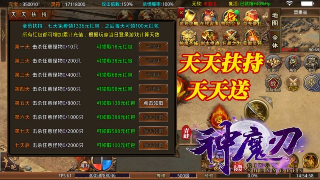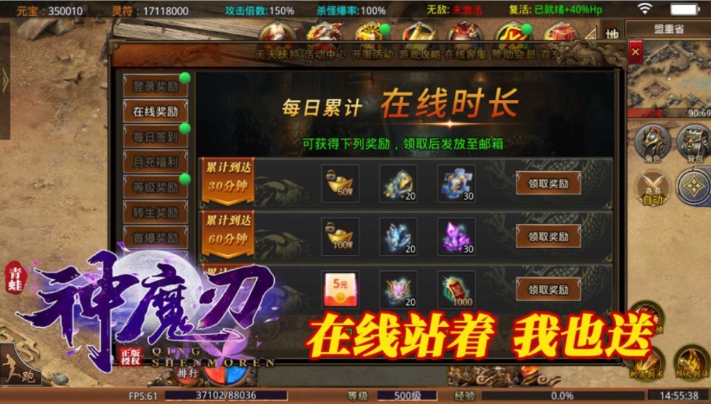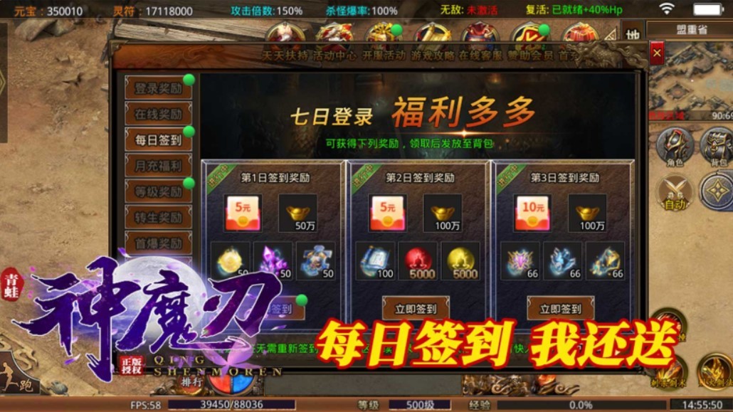 2、每日登录送无限真充卡,海量充值无限送,元宝用到手抽筋!