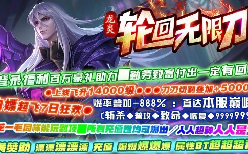 龙炎轮回无限刀传奇游戏,无限刀经典传奇竞技游戏,刺激非凡的争霸传奇,正版传奇竞技游戏,礼包奖励:120各超级背包卷*1,240格超级仓库卷*1,初级全套神饰礼包*1。独家竞技传奇版本,公平公正的传奇竞技游戏,只要肯花时间就能成为传奇顶尖大佬,全屏特效,刀刀争鸣,无限赞助白嫖奖励,非常值得去尝试的传奇竞技冒险游戏。