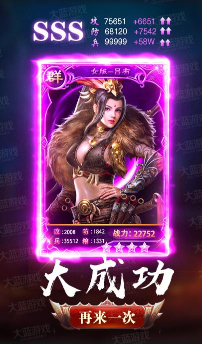 这是一款主打女武将的三国策略游戏。游戏资源也非常丰富。玩家可以通过挑战副本、完成任务等方式获得各种资源和奖励,进一步提升自己的实力和阵容。游戏的结果完全取决于玩家的决定和力量。