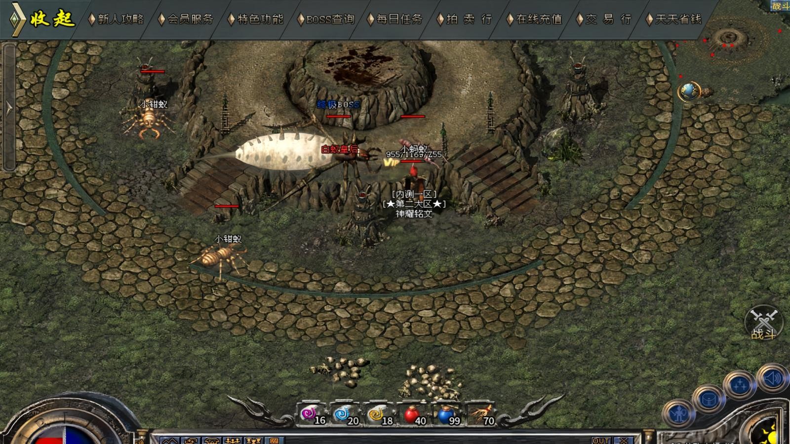 天猫复古176为玩家带来经典复古的传奇玩法,经典的画面风格,各个场景都非常的精彩,还原诸多版本的玩法,游戏内无任何的暗坑和套路,尽情地享受刀刀暴击的爽快体验,获得遍地光柱的震撼感受,书写属于你的传奇冒险旅程。 天猫复古176玩法介绍 1.散人上去优先....
