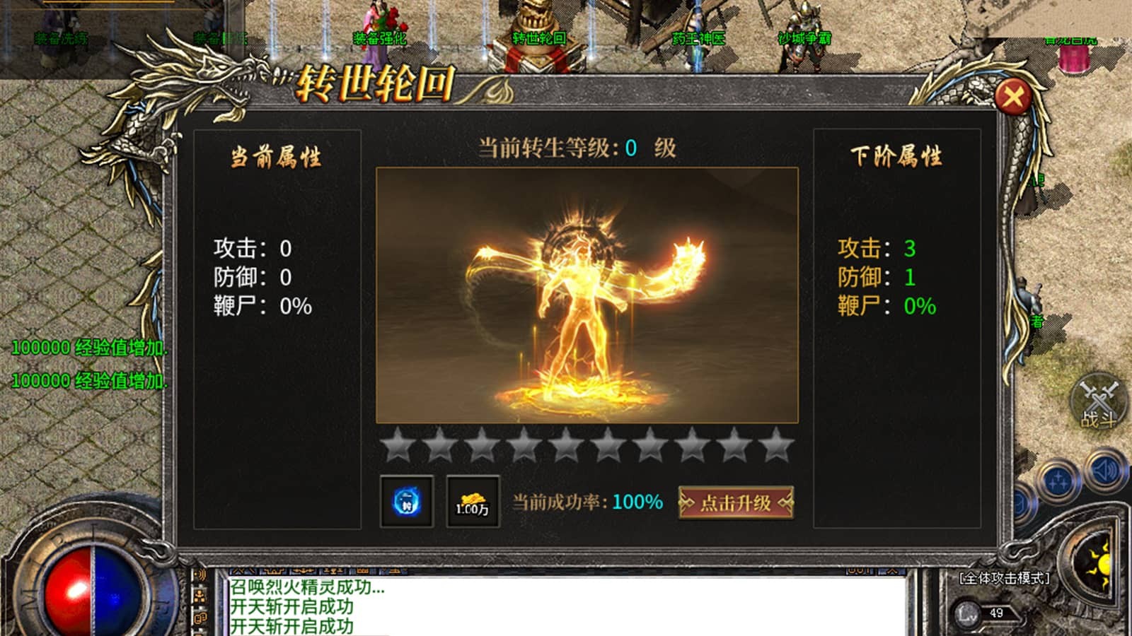 2、小资玩家:先提升等级和转生,早一步到下一个阶段就能领先别人,首冲的卡牌:尸王 让你上线就能殴打各种BOOS。