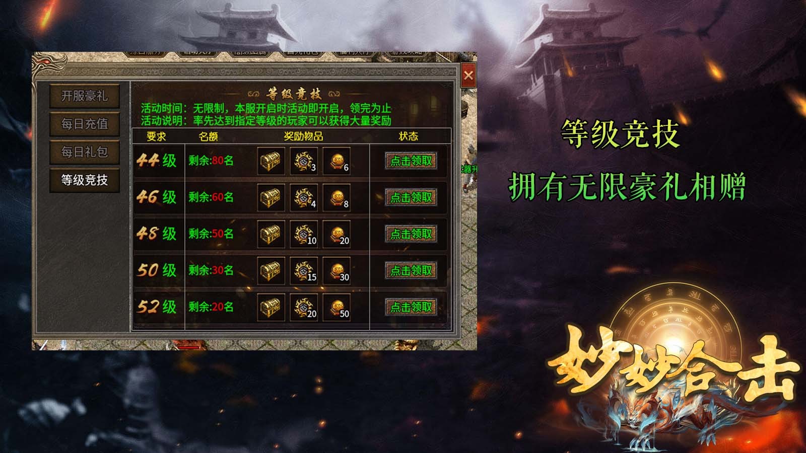 乾元超爆倍攻来袭,刺激经典的传奇竞技游戏,神器传奇,传奇礼包奖励:开天斩*1,逐日剑法*1,转生证明*30,打怪获取声望和传奇积分,轻松兑换超级传奇资源和装备,轻松沙土竞技,盛装神器轻松来袭,坐骑系统轻松搭配,激情pk竞技,百变的专属技能,多样装备轻松过去,....