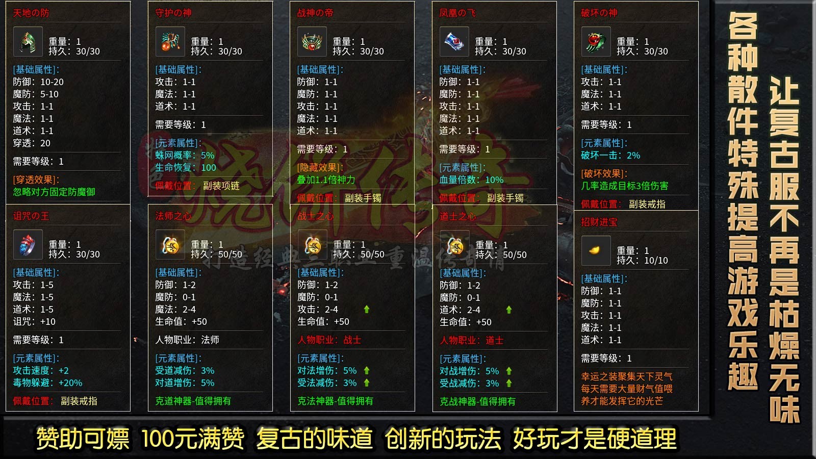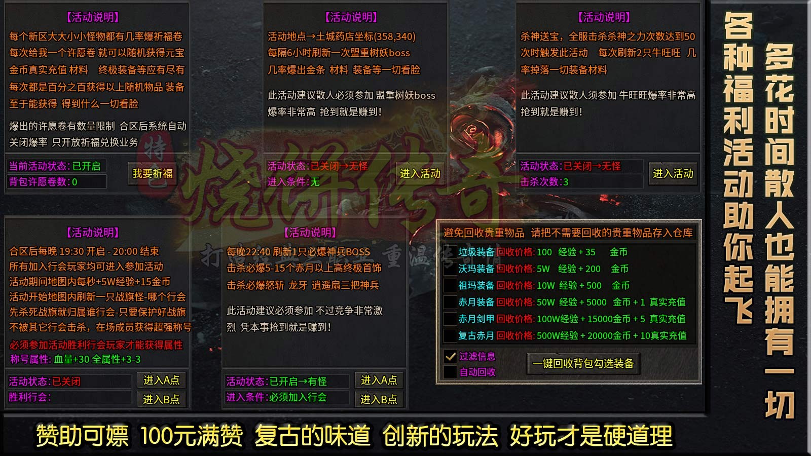 1、0充可手打顶赞,回收赤月以上装备获得充值点包含金币等等…
