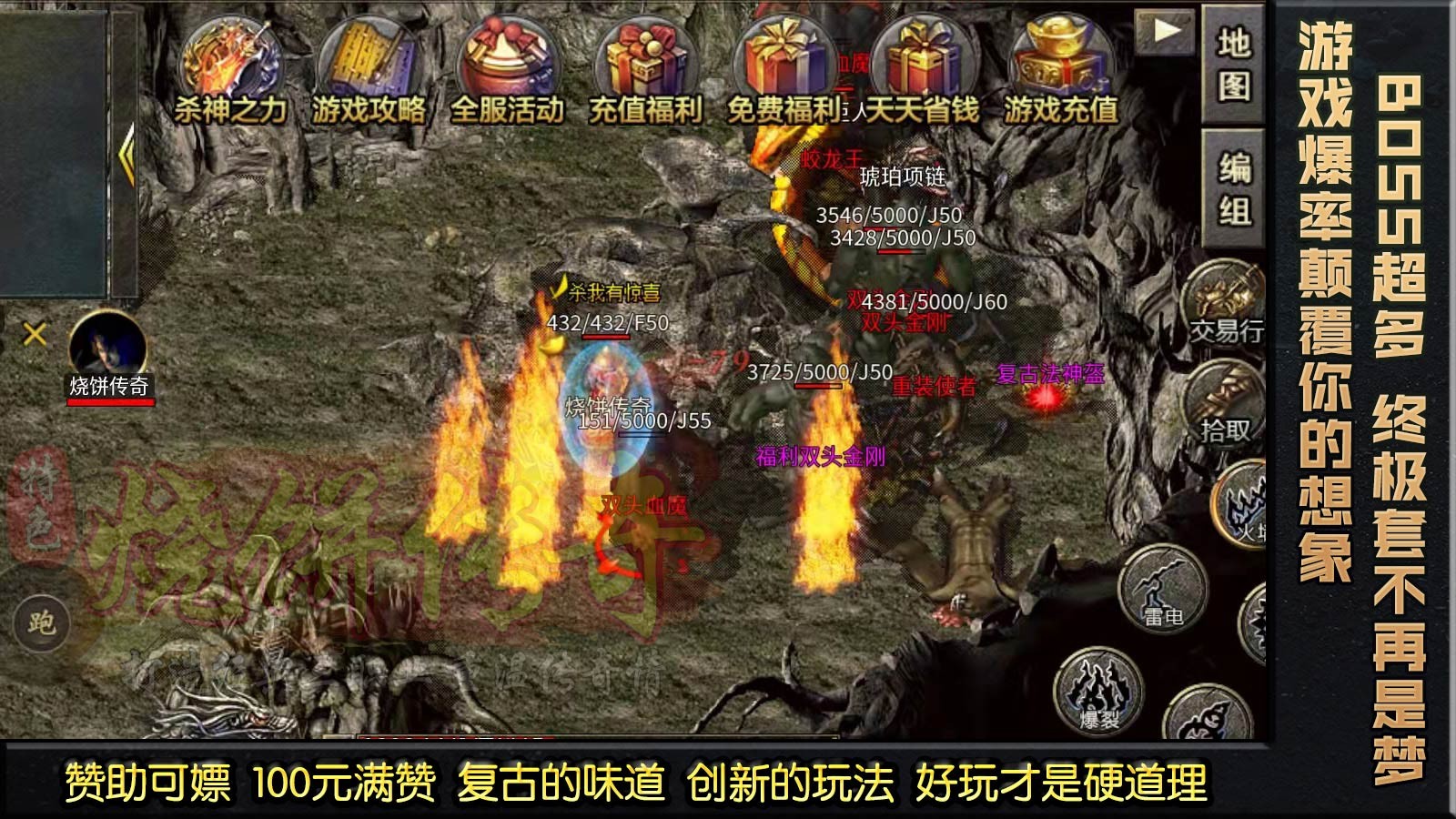 烧饼传奇为玩家带来热血的传奇玩法,上线就自动回收,自动捡物,集合各个版本的玩法,满攻速高爆率的玩法,随时都能够加入到精彩的战斗中,每个人都能够享受最为爽快的pk竞技,散人靠时间免费到终极一刀秒怪玩传奇,开启属于你的全新冒险。