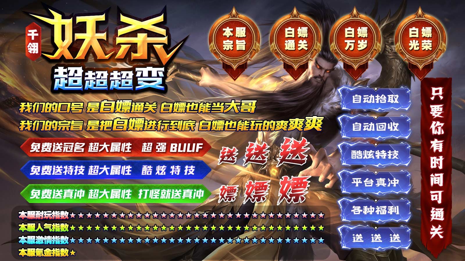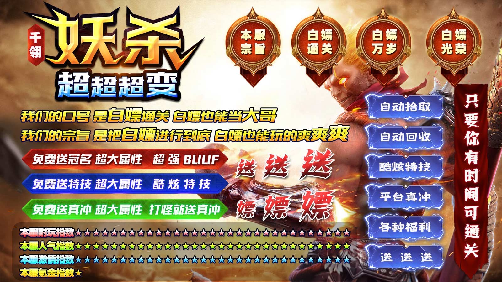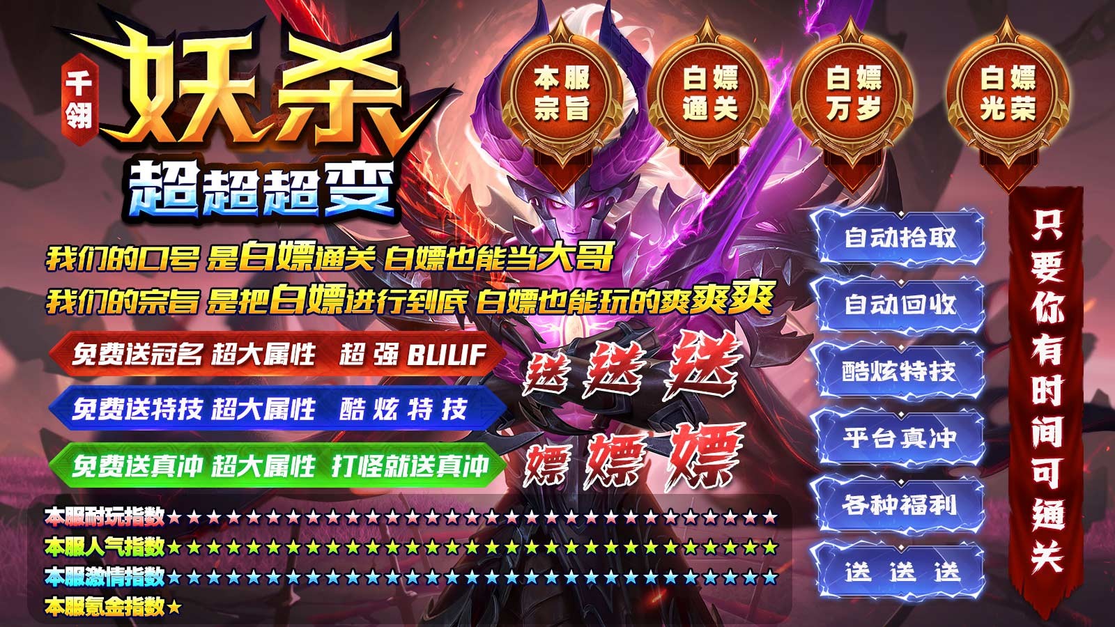 千翎妖杀超超超变为玩家带来超变版本的传奇玩法,免费自动挂机、自动回收,装备元宝全靠打,小怪也能够掉落顶级的神装,随时都能够加入到刷怪打金的战斗之中,满攻速高爆率的玩法,随时都能够加入到精彩的战斗,收获丰厚的奖励,畅享精彩热血对决。
