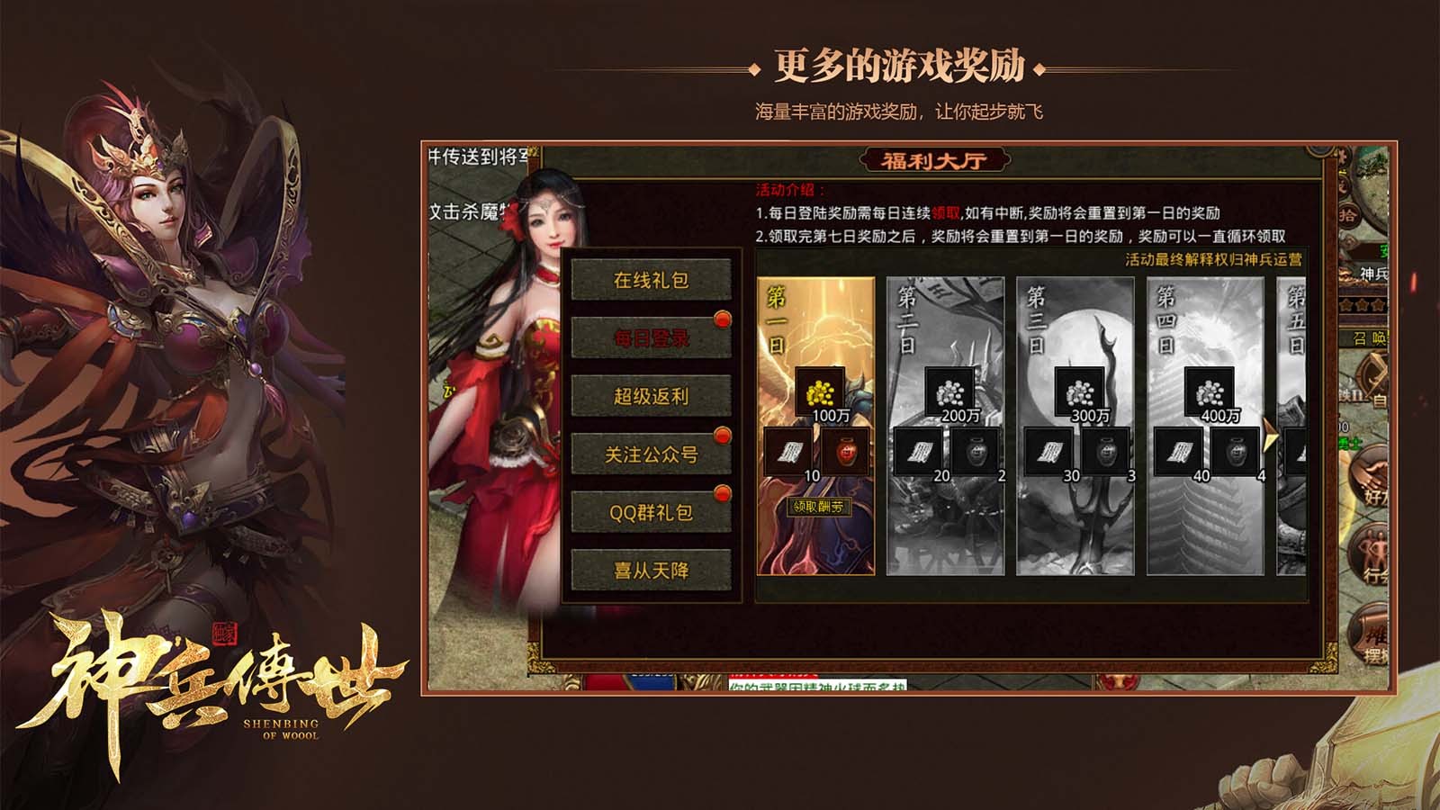 神兵传世贺岁版为玩家带来经典的三职业传奇玩法,战道法完美平衡,随时都能够自由转职,更有超多创新的玩法等待着你的体验,整体满攻速高爆率,随时都能够加入到精彩的对决中,尽情地享受全屏光柱的爽快体验,尽情畅玩整个传奇世界。