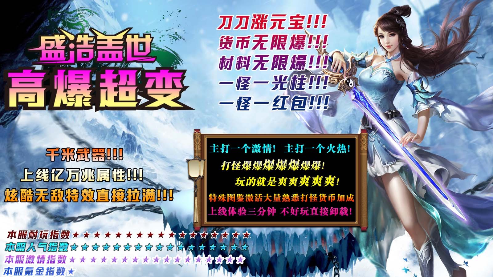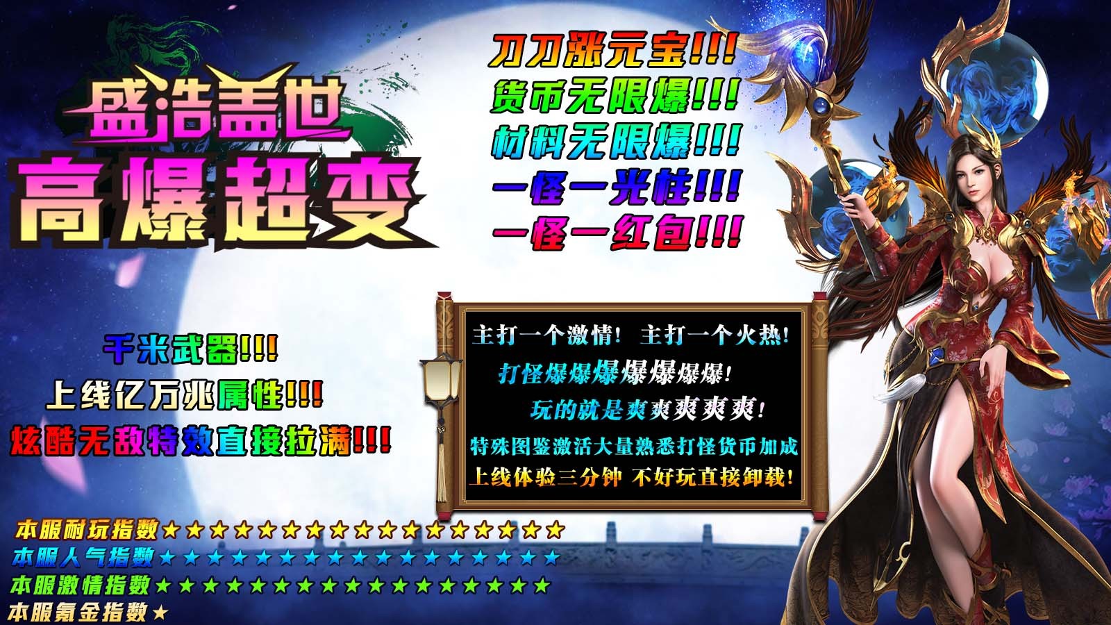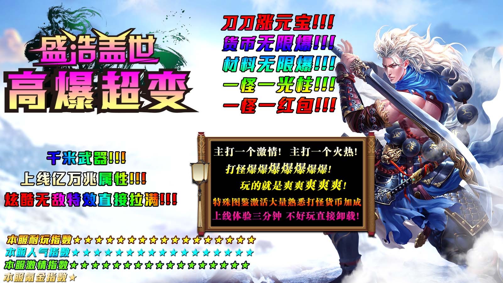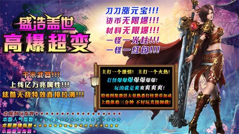 盛浩盖世高爆超变为玩家带来超变版本的传奇游戏,本服还原战道法三大职业,随时自由转职,让你能够体验极致的战斗快感和丰富的游戏内容,主要的货币为金币,全部靠打,材料装备非常保值,散人花时间即可到达终极,享受沉浸式的精彩冒险。