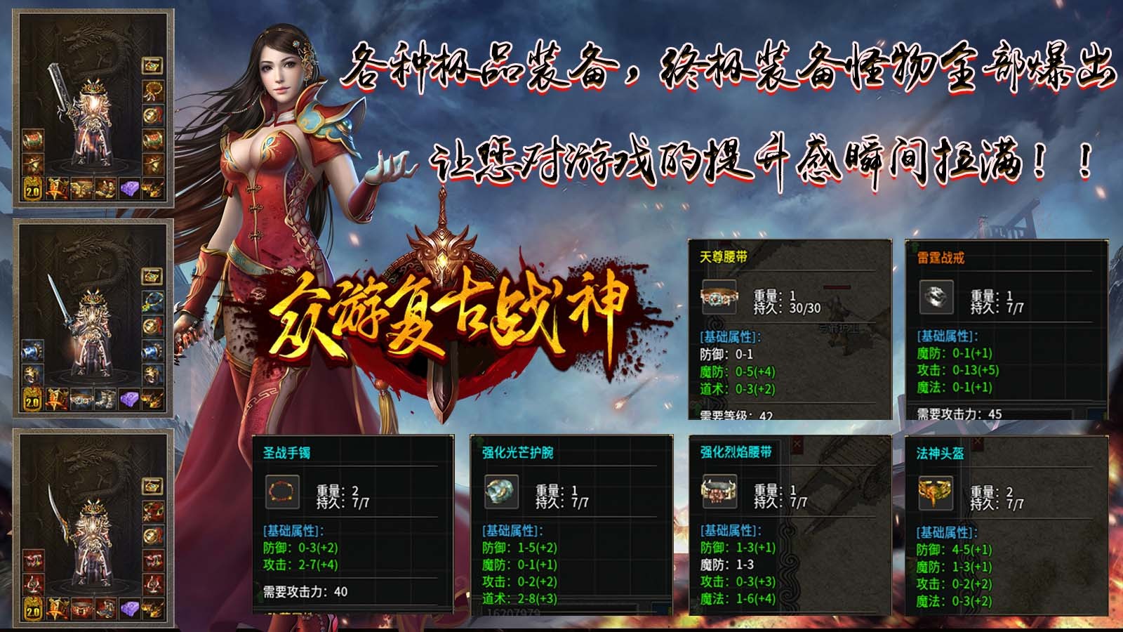 9、战神首饰开天为终极,极品掉落率高,任何地图均有几率掉落极品装备!