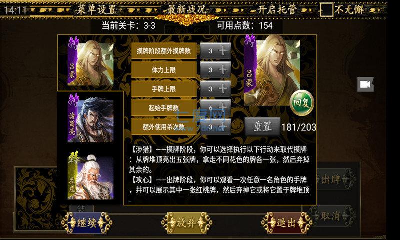 人数4人,反贼3个,主公1个,其中主公是扮演神·吕布的,3个反贼要一起杀死神·吕布才算完成任务.