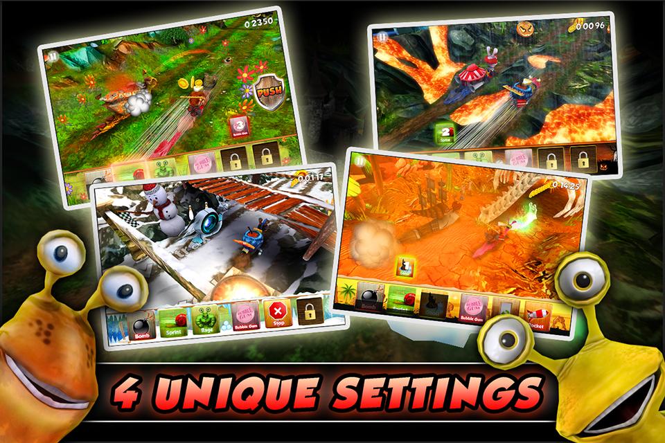 《极速蜗牛》这款让爬行速度极慢的蜗牛成了飙车的主角。除了蜗牛,游戏中还混入了一只乌龟,乌龟同样是步伐矫健好似练过轻功。由此这样一场生态版竞速游戏就此展开,看改装蜗牛如何飙车竞速。