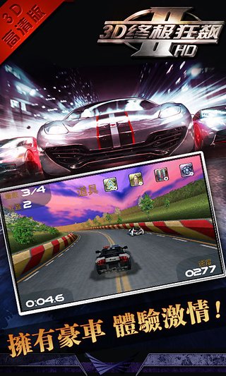 《3d终极狂飙2》高清版,经典赛车游戏中一部闪耀夺目的精品大作!全球最流畅真3d赛车Android游戏,三千万玩家鼎力推荐,无需额外数据包,完美支持所有手机哟!游戏内云集了各款经典豪车,精美的画面、丰富的道具、变幻莫测的赛道战场,令玩家深深的陶醉在超爽的竞速体验之中!快发动引擎!轻松玩转,让我们尽情陶醉在超爽的竞速体验之中!免费试玩,还不马上体验!