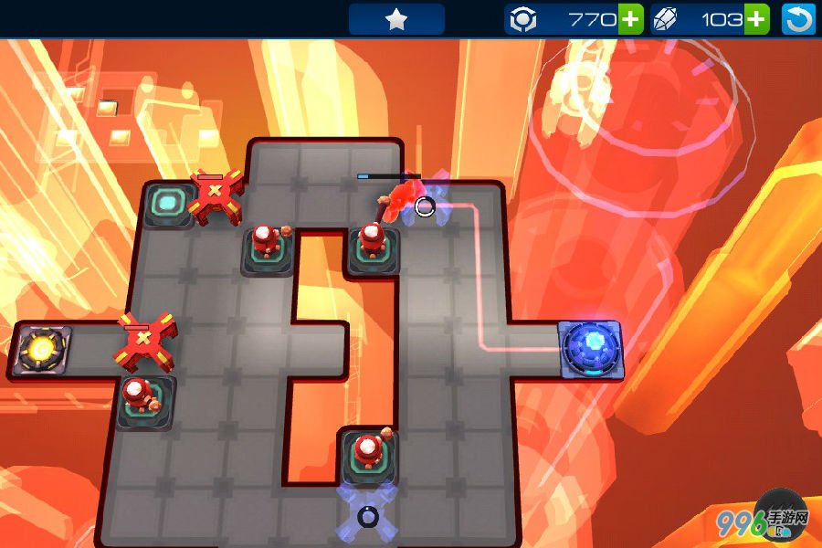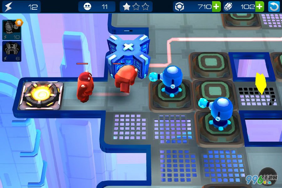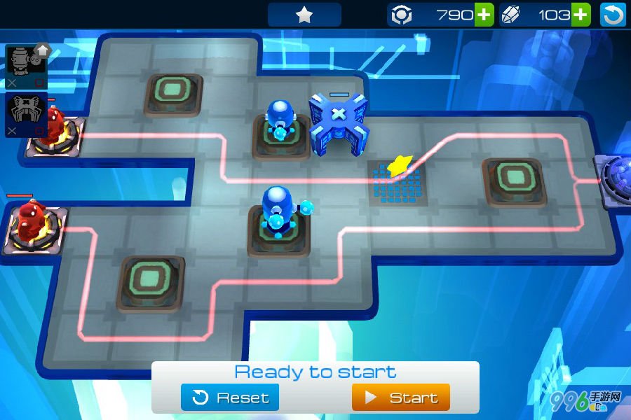 攻击地图里,玩家只要往图中右边的核心里派遣足够数量机器人就能获胜,而防御地图则是完全相反