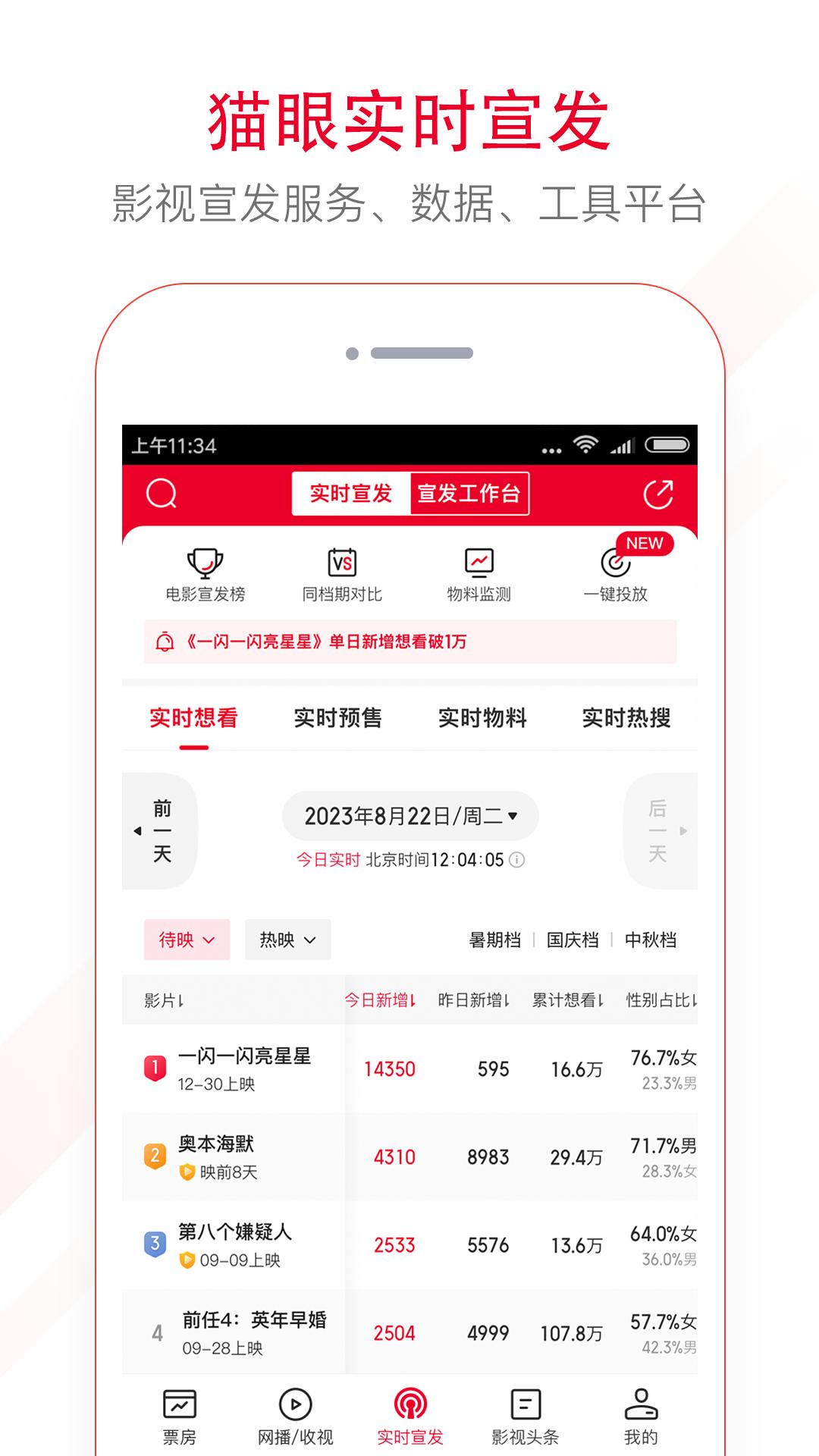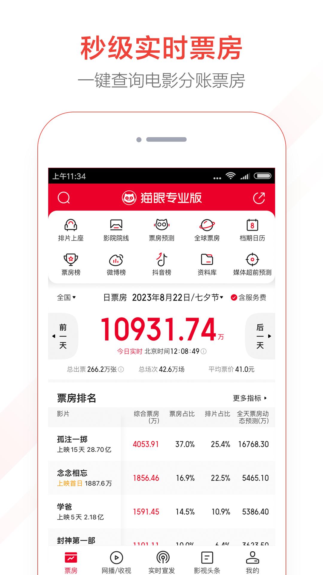 猫眼专业版实时票房官方版是一款非常好用的电影资讯软件,用户在这里可以看到国内热门以及最新的各种影视资源,并且还为用户提供实时最新票房、排片、影院经验数据等信息,让用户可以了解到该影视是否好看值得看!不在因为看完发现是个烂剧而难受!