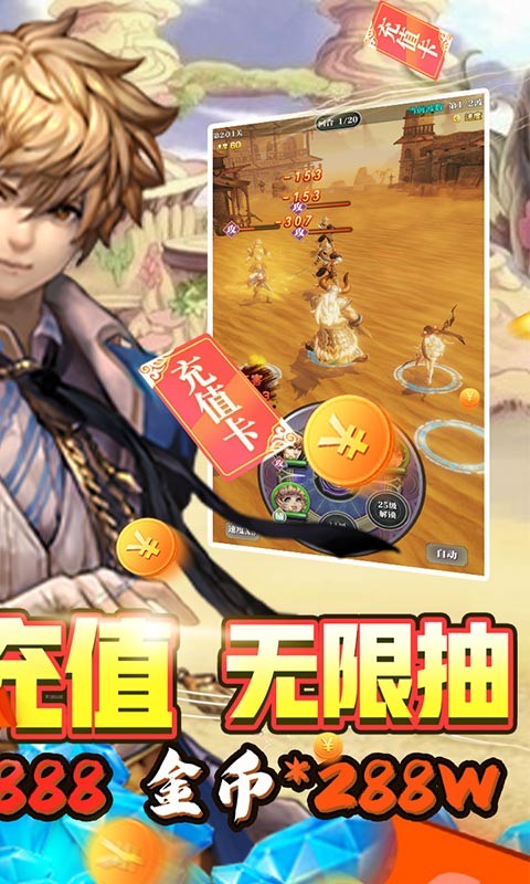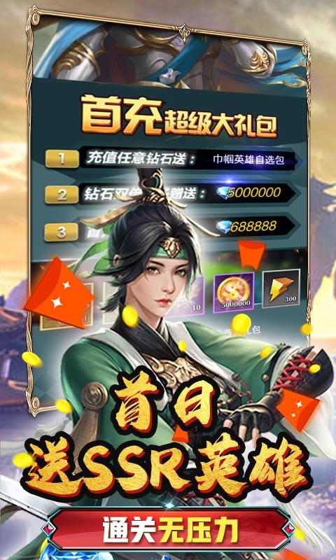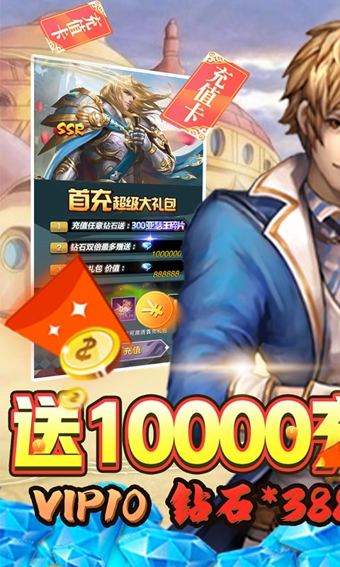 1、创角即送上线v10、钻石38888、金币288w,游戏奖励非常的多样!