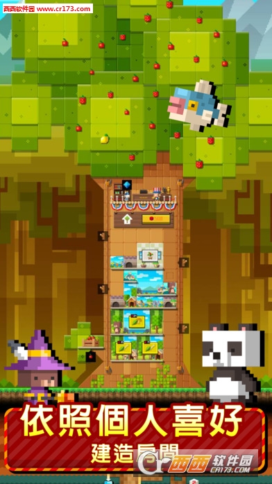 玩家可以依自己喜好,层层往上堆叠属于自己的大树,游戏没有关卡限制,只要完成指定任务,用心滋养灌溉,就有机会让大树茁壮成长高耸入云。在像素树内,玩家可以自由打造喜欢的可爱小窝,无论是梦幻的动物房间“可爱的大熊家”,还是看起来十分可口的甜点造型房间“糖果水族馆”、“热狗堡”,还是主题造型房间“王室卫队”、“幽深洞穴”,都能自由发挥。