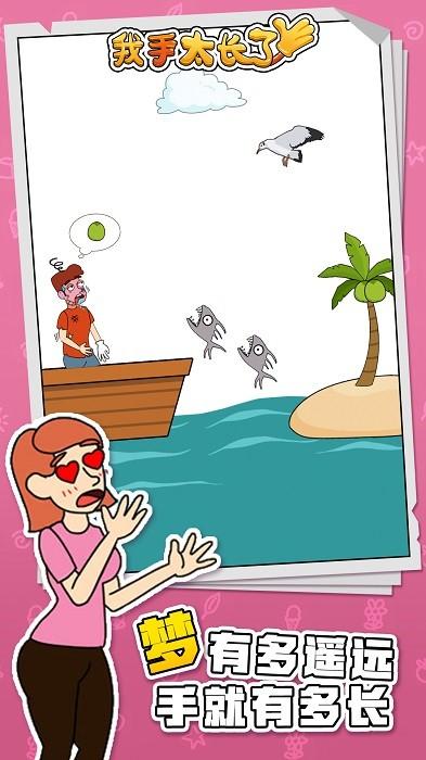 2、瞭望远处发现小岛上有新鲜可口的椰子!看我无限拉伸手臂,躲避夺食的海鸥和海里的食人鱼,轻松摘取食物。