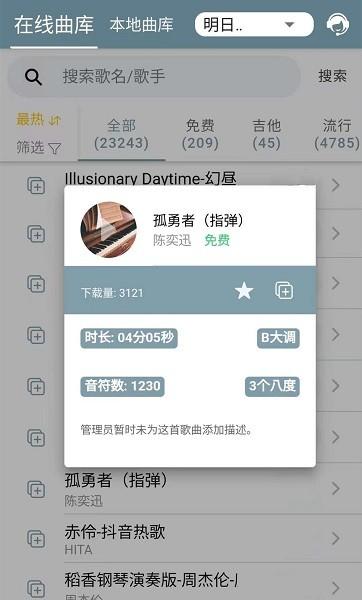 下载软件启动即可免费演奏200多首歌曲,无需繁琐注册步骤。安卓版通过无障碍服务实现自动点击, 无需root,纯绿色、安全可靠。软件界面设计与普通音乐播放器相似,易于理解,简单易用。