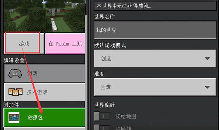 3、点击“游戏”,选择自己附加件的“资源包”