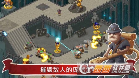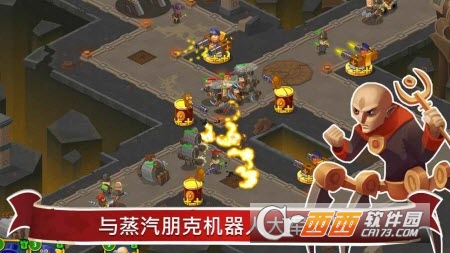 在《Steampunk TD:塔防游戏》中,你将面对若干波无情敌人的进攻。 建造并加固防御塔:加特林机枪、元素火焰喷射器、轰炸机、特斯拉机器人以及发电机。