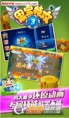 在游戏中,你可以召唤机甲战宝,配备战宝僚机,化身移动炮台,使出经典招式菠萝蜜多斩;还可以召唤合体果宝战神,全屏施展威力无比的元气斩!