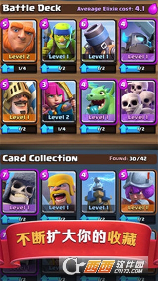 收集皇室战争家族成员和您熟悉的《部落冲突》军队,法术和防御建筑等卡牌,打造和升级您的卡组。
