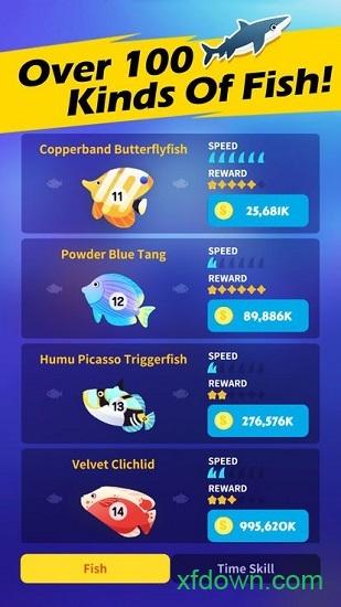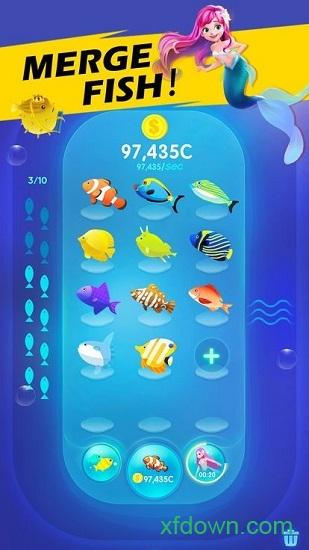 通过合并获得更高级漂亮的海洋鱼,将鱼拖动到跑道上从而获取游戏金币;