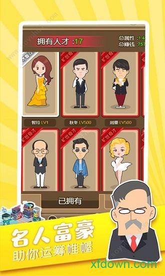我是首富游戏是一款经营模拟手游,你将在这里成为一名首富,并打造更丰富的资产,独具一格的玩法模式,精致华丽的画面风格,并且还可以招募各种各样的员工来为你效力,通过奋斗白手起家,一步步成长,垄断所有的行业与企业,有兴趣的玩家快来旋风手游网下载吧!