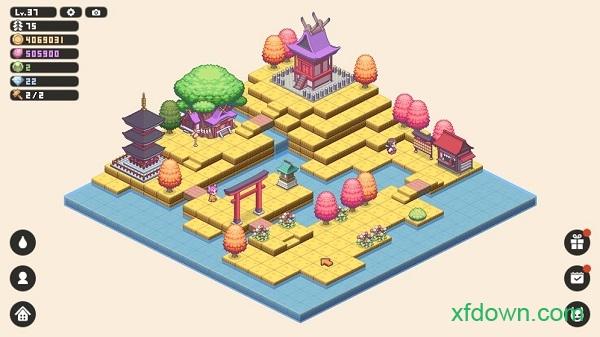 游戏以日本神社为主题,画风清新,可爱又简单,玩家在游戏中布置自己的神社,通过防恶魔入侵获得建筑,通过收集来访者的金钱和愿力使之升级。游戏围绕着建造设施>让信徒参拜>获得资源>强化设施>打倒邪神>神社升级>建造设施来玩。