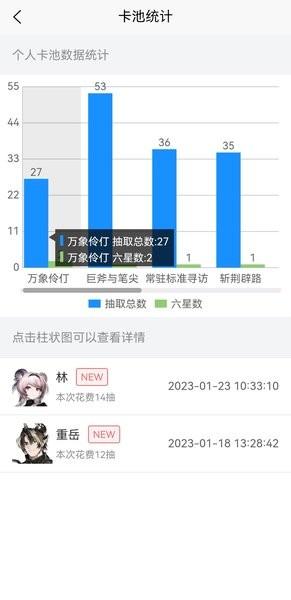 明日方舟寻访统计工具这是一个由明日方舟玩家写的一个开源项目,用于储存明日方舟的抽卡数据并做一些简单的分析,拥有记录明日方舟抽卡数据、分析抽卡概率、导出明日方舟抽卡记录为表格、明日方舟自动签到等功能。就是还原了原作里的干员寻访系统,并单独拿出来,制作了一个仿版的出货游戏,如果各位想要辨明自己欧还是非,那么不妨一试,无聊抽着玩,还是挺有趣的!