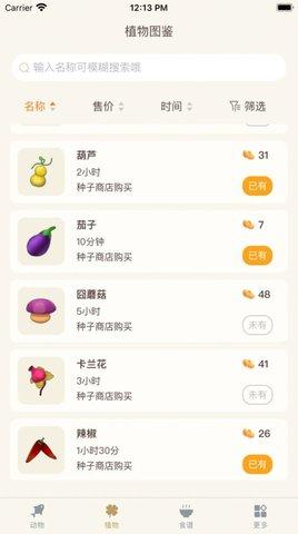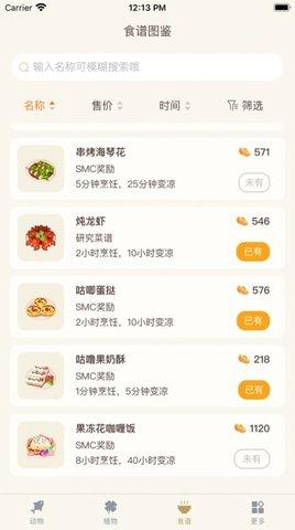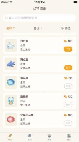 1、这里有:动物图鉴、植物图鉴、食谱图鉴、家具图鉴、服饰图鉴,还有图鉴的详细信息;
