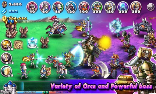 一款防御类游戏,用你的智慧去粉碎敌人的部落和摧毁的兽人!帝国之间的战争和兽人已经开始了!兽人被黑暗诅咒了。他们攻击残酷又激烈,行动迅速,并且几乎是坚不可摧的!据预测,一个真正的勇士将领导军队去征服兽人,并且成为了国家英雄!战士,使用你的骑兵,步兵,弓箭手和矛兵,用你的智慧去粉碎敌人的部落和摧毁的兽人吧!开启新的军队和升级他们的属性来获得更强的军队!