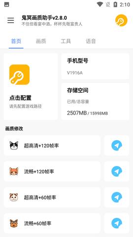 鬼冥画质助手APP是一款使用方法简单,功能全面,完全免费,无需root权限的画质优化工具,通过这款APP能轻松解决各种画质问题,120帧,180帧等多种画质模式都可通过你的设备硬件来针对优化哦,通过自定义调整画质参数,达到最佳的画质效果,享受高清吃鸡体验。