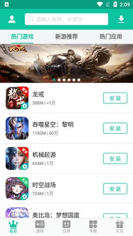1、首先打开手机里的逍遥市场app,在首页可以看到很多热门游戏的特殊以及bt版本可以直接下载安装,还有礼包可以领哦。