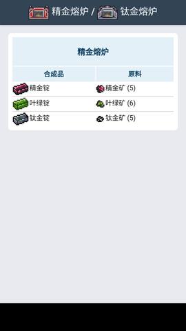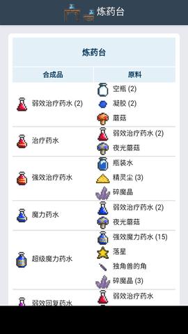 泰拉瑞亚合成表中文版APP是泰拉瑞亚玩家随身必备的速查手册。帮助您更好地在泰拉瑞亚世界中畅游。并且完美配合最新版本,让玩家更好体验游戏,包含大量合成方式,可以在游戏中自给自足,而且软件安装包小,界面清爽无广告,欢迎下载使用!
