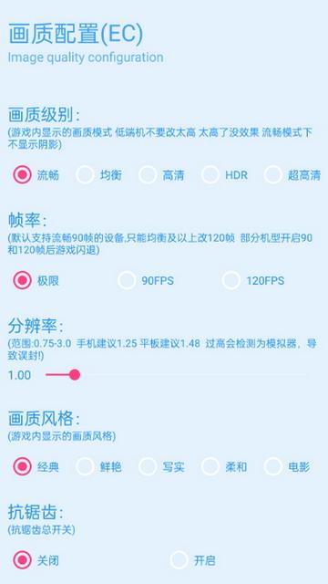 青辰画质助手120帧手机版是一个非常有用的图像质量助手,该软件可以帮助用户提高游戏的图像质量,具有非常强大的功能,软件使用非常简单。用户只需要按照提示操作只需简单的操作,就可以启动应用,开始愉快的游戏,在吃鸡的战场上一展身手。欢迎有需要的朋友前来下载体验!