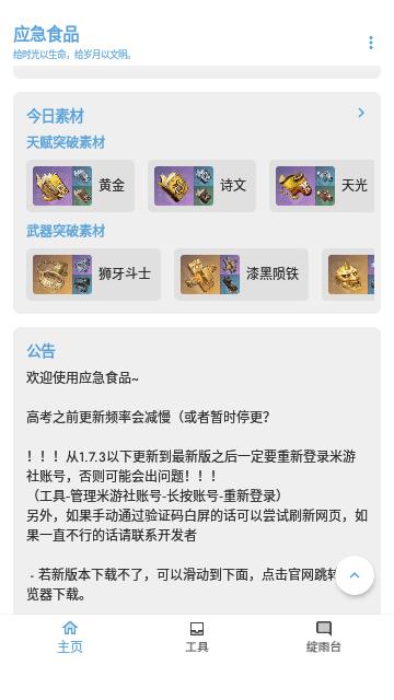 应急食品APP是一款专门为原神玩家推出的辅助工具,玩原神的小伙伴们在下载了应急食品APP后,可以在其中查看到自己账号的抽卡记录、同时还能够分析小伙伴们抽卡记录,看自己是欧皇还是非酋。同时,满足原神小伙伴们的大部分需求,其中还有多种实用功能等待着小伙伴们来使用。