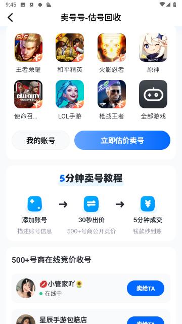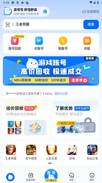 卖号号是一款十分不错的账号交易软件,这款软件里面有非常多的游戏账号,无论用户喜欢什么样的游戏都能够在这里找到对应的游戏账号,并且用户能够在这里购买或者租赁自己喜欢的账号,无论是购买还是租赁都是十分便宜的,同时用户还能够在软件中对自己的游戏账号进行估价。