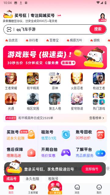 买号狂是一款十分好用的账号交易软件,这款软件里面有非常多游戏的账号,无论是手机游戏还是电脑游戏,无论是王者、原神还是火影、LOL各种游戏的账号用户都能够在这找到,并且用户还能够在这里对自己的游戏账号进行估价,同时软件中还有关于游戏的各种资讯。